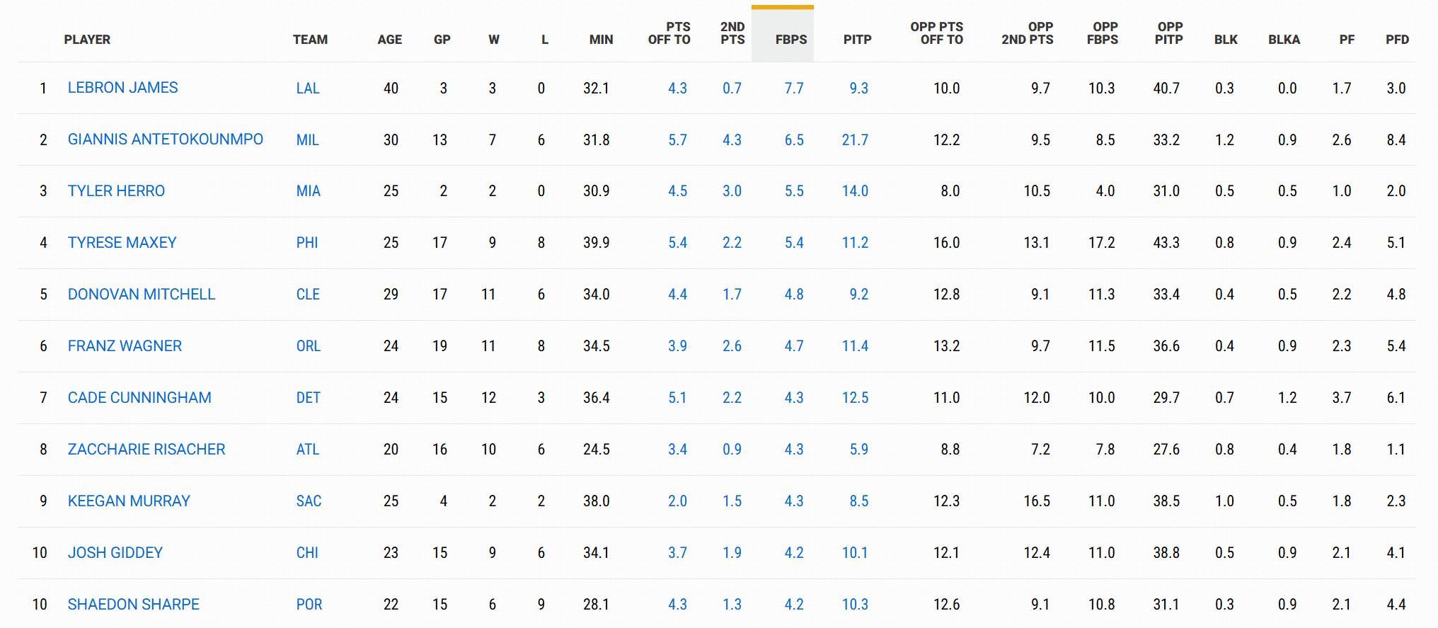 詹姆斯本赛季代表湖人出战3场常规赛,场均登场32分钟得到17.7分5篮板8.7助攻,据NBA官网数据统计显示,詹姆斯的场均FBPS(fast break points快攻得分)为7.7分,超越字母哥的6.5分排名全联盟第一。
