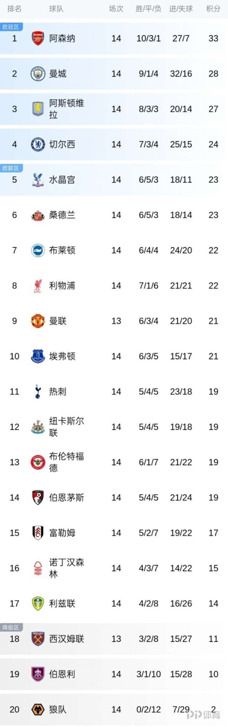 英超第14轮多场比赛结束,阿森纳2-0布伦特福德,切尔西1-3爆冷利兹联,利物浦1-1憾平桑德兰。