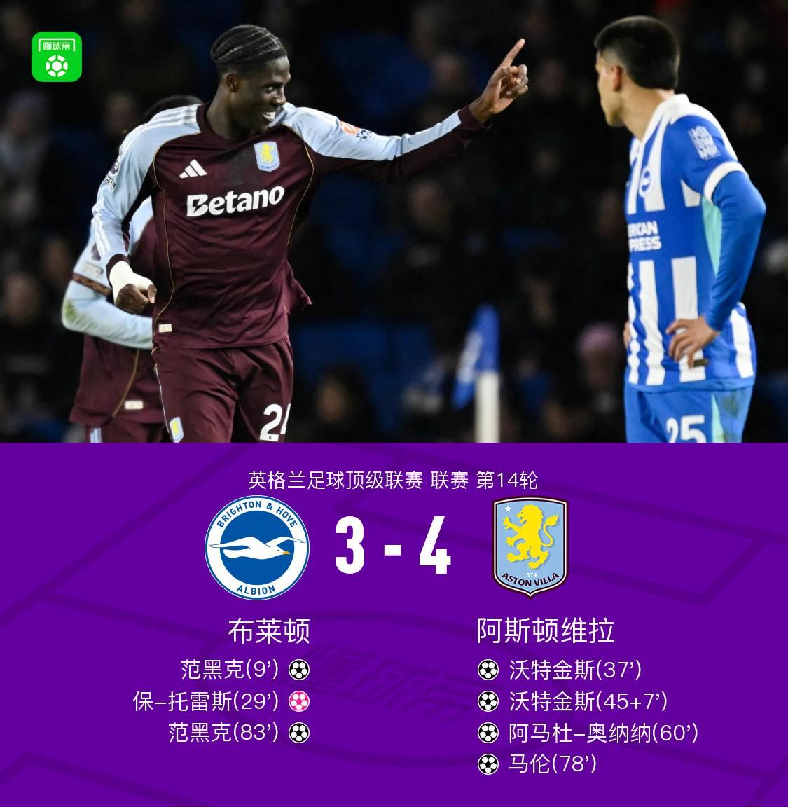 维拉客场4-3逆转布莱顿,沃特金斯双响,范黑克2球难救主